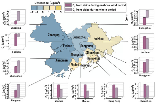 The differences in the contribution of ship emissions to O3 concentrations in 11 cities in the GBA region during the onshore wind period compared to the whole time period.