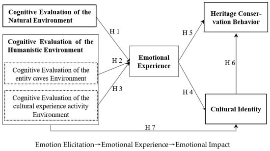 Emotional evaluation theory suggests that the process of cognitive evaluation of environmental stimulus is a determinant of the generation of emotions. Tourists’ emotional experiences arise from the process of cognitive evaluation of stimuli in the tourism environment, such as the natural and humanistic environment. In a study of souvenir design based on emotional memory, Zhu et al. [] found that humanistic factors of the destination, such as tourist souvenirs, aroused tourists’ positive emotional experience. Both natural and humanistic environmental factors can stimulate tourists’ positive emotions, and heritage revitalization experience with rich cultural factors such as traditional folklore, song and dance, and other dynamic experiential interactions can induce a greater stimulating effect than the natural environment []. From a tourist perception perspective, Yao et al. [] found that children have a greater preference for experiential activities that require hands-on experience, and this participation can enrich the tourism experience for children and parents. Hou [] found that cultural experience activity in digitalized museums received a high degree of attention from tourists for their novel visual experience and spiritual enjoyment, which improved the quality of their tourism experience. The Dunhuang Mogao Grottoes were used as a case study site and the humanistic environment of the Dunhuang Mogao Grottoes included entity caves and cultural experience activities []. Accordingly, this study proposes the following research hypotheses:
