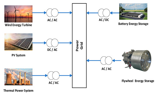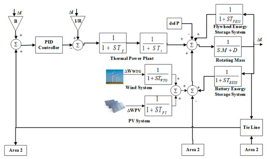 The installation of renewable energy sources addresses the problems caused by conventional energy sources in the environment during electric power generation and the matching of sudden load-demand situations. Pollution (air, water, and noise) and global warming are major issues for the environment, and one source of pollution is electric power generation. The traditional techniques of generating electricity cause environmental degradation. In order to reduce pollution, RESs (solar and wind power plants) are being introduced into the power generation sector. One of the key causes for the penetration of RESs is the shortage of fossil fuels. The inclusion of RESs is a difficult undertaking because RESs are typically nonlinear power-generation sources. When incorporating RESs into the electricity grid, numerous quality challenges arise—notably, the oscillation of system frequency. In order to overcome this crisis, the load frequency control (LFC) method is used to maintain frequency standards in the power system, and a secondary controller must be implemented into the scheme in order to preserve frequency stability [1,2,3]. In particular, the secondary controller maintains the frequency stands and important parameters within the predetermined standard values (settling time and stability). The settling time is the time required to bring the frequency oscillation to a predefined value. Stability is maintaining the retained standard values in the system frequency at sudden loading conditions.