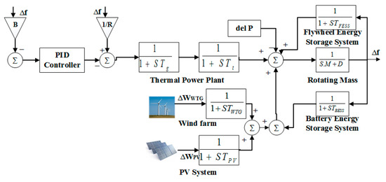 A microgrid is created by combining thermal, PV, wind, and energy storage systems (BESS, FESS). The governor and turbine are part of the thermal power plant. Figure 1 depicts the general construction of an alternating current (AC) microgrid. The Appendix A contains the nominal parameters of the proposed system model [37]. The mathematical function of the proposed system model is provided in Equations (1)–(7), and the transfer function model of the investigated system is presented in Figure 2 [37]. In Figure 2, B denotes the biasing constant, R represents the regulator constant, del P is the small load disturbance, f represents the system frequency, and ∆f denotes the change in frequency.