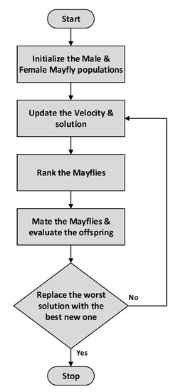Mayflies are insects of the Ephemeroptera order, which is the oldest group of insects. They are mainly visible in the UK throughout May, which is where their name comes from. This algorithm was motivated mostly by the behaviour of adult mayflies (which includes crossover, mutation, swarming, nuptial dance, and random walk). Two sets of mayflies are initially generated at random to represent the male and female populations. In the second phase, the velocity of each male fly is updated, and then flies are ranked depending on their velocity. In the end, the highest-ranking flies mate with female flies. Likewise, the gain values are tweaked using this algorithm. Figure 4 depicts the MA’s functional flow [23].