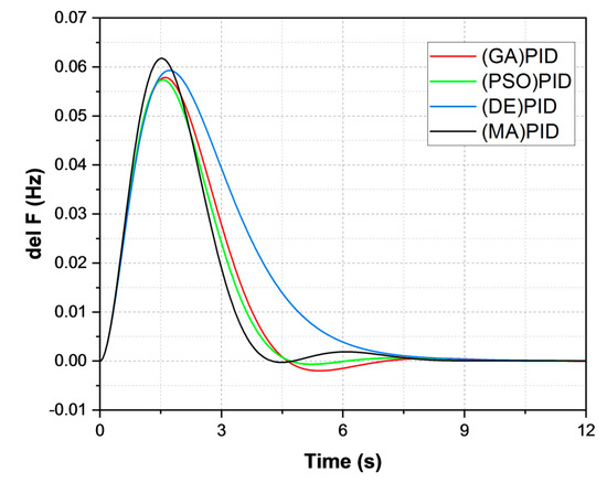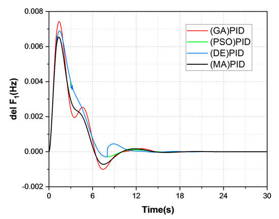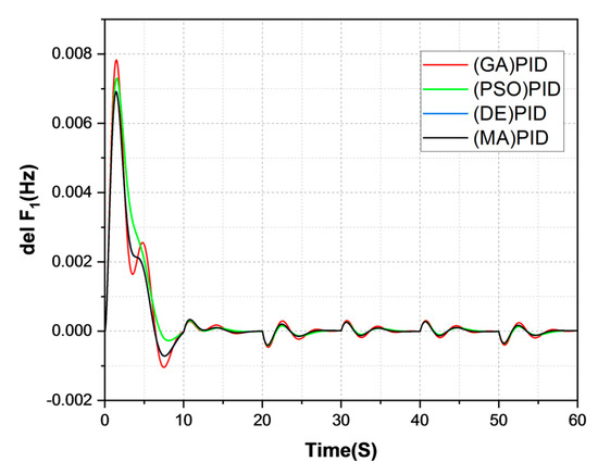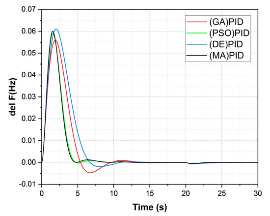 The projected controller (MA-PID) is suggested as a subordinate controller to test the behaviour in the LFC crisis. In order to test the suggested technique-tuned controller’s ability, a one percent step load disturbance was applied. The responses of the system GA, PSO, and DE-PID controllers were compared in order to demonstrate the superiority of the projected MA-based PID controller. Figure 5 depicts the outcome comparison of the system frequency.