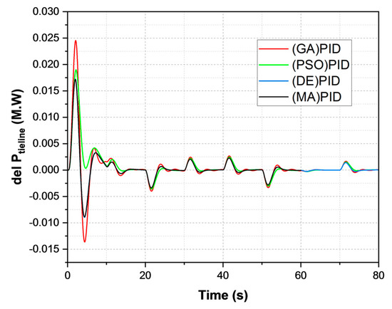 Section 5.1 investigates the performance analysis of the suggested controller tuning approach (MA-PID) in the MMG with 1% SLP. The delF comparison of area 1 and the tie line power flow comparison of the MA-, DE-, PSO-, and GA-tuned PID controllers are provided in Figure 7 and Figure 8, respectively.