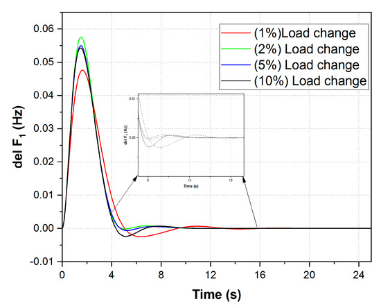 Figure 11 and Figure 12 clearly illustrate that the smooth operation of the proposed technique-adopted controller (MA-PID) is superior at the time of parameter variations. The controller controlled the deviation in the system frequency under different loading conditions, from which the proposed controller is the most suitable to implement to solve the LFC crisis.