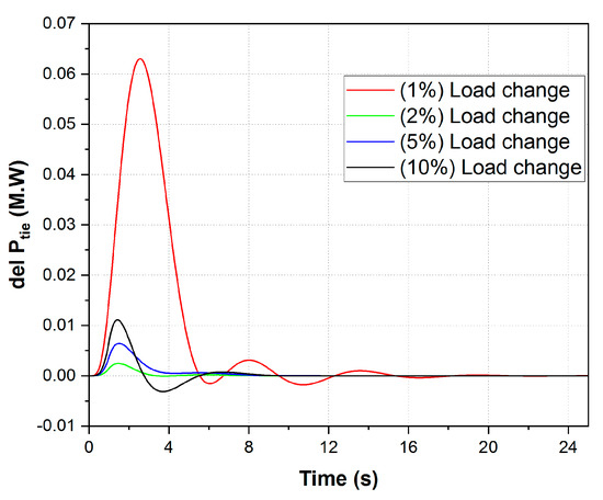 In the robustness analysis, different levels of SLP were applied to area 1. The response comparisons of the system frequency and tie-line power flow between connected areas (del F1 and del Ptieline) are plotted in Figure 11 and Figure 12, respectively.