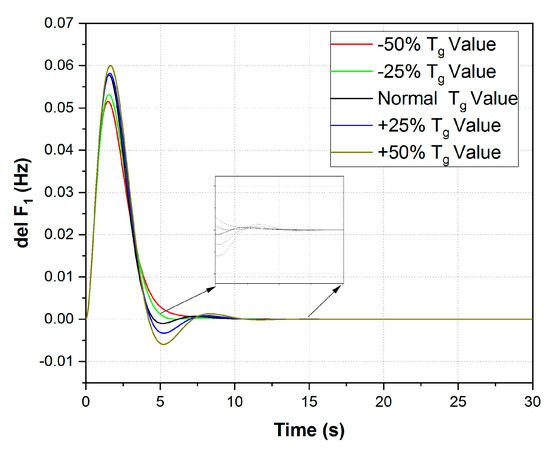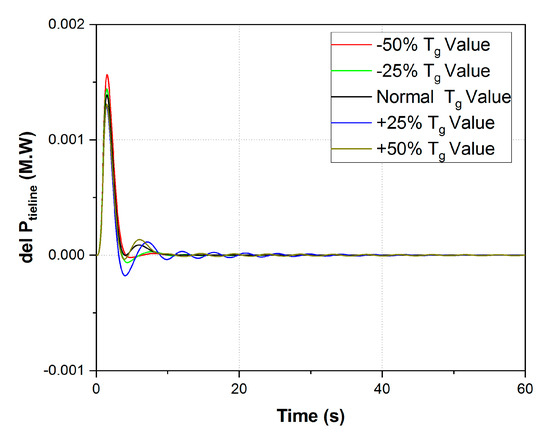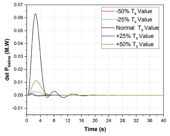 A sensitivity examination was conducted with different ranges of system parameter variations of governor time constant (Tg) and turbine time constant (Ts) (±50 and ±25%) from their nominal values. The response comparison of the system frequency and tie line power flow are presented in Figure 13, Figure 14, Figure 15 and Figure 16.