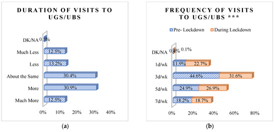 The majority of participants declared to have an UGS/UBS in less than 300 m. from their residence (47.1%) and easy access (33.4%) to an UGS or UBS (Table 3). Regarding the duration of visits, no major changes were observed, as 30.4% of respondents stated that they spend “about the same time” and 30.9% “more time” to UGBS in reference to the pre-lockdown period (Figure 1a). Chi-square tests showed substantial differences in terms of frequency (p < 0.001), motivation, and typology. Specifically, prior to the COVID-19 outbreak, 44.6% of participants visited UGBS for “three days per week” but during the quarantine, the same percentage decreased to 31.6%. In accordance, the respondents who limited their visits to “one day per week” increased from 11.9% to 22.7%. A slight increase is also seen for the category of “five days per week” (24.9% pre-lockdown and 26.9% during-lockdown) while the percentage of “seven days per week” remained at 18% (Figure 1b).
