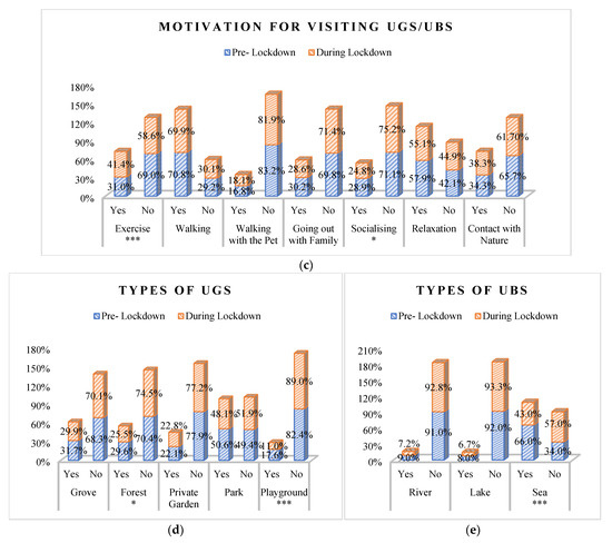 Use Patterns of UGS/UBS pre- and during the lockdown. (a) Duration of visits to UGS/UBS; (b) Frequency of visits to UGS/UBS; (c) Motivation for visiting UGS/UBS, (d) Types of UGS; (e) Types of UBS, d/week: days per week, N = 927, * p < 0.05, *** p < 0.001 by Frequencies and Chi-square tests.