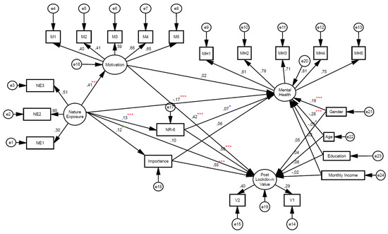 Path diagram of structural equation model along with standardized estimates and levels of significance, * p < 0.05, ** p < 0.01, *** p < 0.001. A significant level of * p < 0.05 is indicated by the blue color, ** p < 0.01 by the green color, and *** p < 0.001 by the red color.