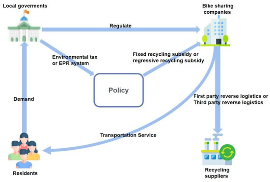 China urgently needs a scientific, green, and efficient approach to manage the bike-sharing industry in order to balance, as much as possible, the reduction in the financial pressure on local governments and the sustainable development of the bike-sharing industry, and to contribute to the goal of carbon neutrality [6]. Therefore, the General Office of the State Council of China issued a program for the promotion of the extended producer responsibility (EPR) system, which is a necessary system option for developing a circular economy [7]. This program aims to encourage producers to undertake their resource and environmental responsibilities, thereby boosting the overall competitiveness of their products and improving resource and environmental benefits [8,9]. In the traditional management approach, producers shift the responsibility for green development to the government through the payment of environmental taxes, and they rely on the government to deal with the pollution issues generated during the product life cycle in a uniform manner. In contrast to the traditional management approach in which environmental tax (ET) is the main measure, EPR emphasizes the sharing of responsibilities among different actors in the product life cycle, such as producers, consumers, recyclers, and government. EPR also implements the incentives and penalties in the system in the form of local government penalties, subsidies, and recycling conversion benefits. The development of EPR has led to the involvement of stakeholders in environmental protection actions and has achieved remarkable results worldwide. For example, Spain and Portugal have achieved a significant increase in the recycling rate of waste plastics through the EPR system [10]. EPR is an effective tool for the development of a circular economy, and the promotion of the EPR system will effectively improve resource utilization, reduce waste emissions, and protect the environment [11].