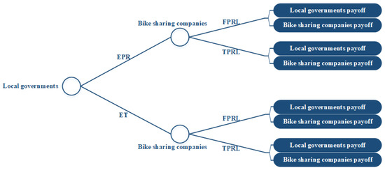 In this paper, we construct an evolutionary game model with a large dual population consisting of a limited number of individual local governments and bike-sharing companies. Each of the two groups has two pure strategies to choose from. The strategy space for local governments is SG = {ET, EPR}, and the strategy space for bike-sharing companies is SE = {FPRL, TPRL}. When bike-sharing companies choose FPRL, they pay the recovery cost (CE1). Meanwhile, in order to reduce the product disposal rate and prevent a vicious cycle, local governments implementing ET will collect recycling and disposal payments from bike-sharing companies (CE3) [55]. Because EPR is designed to incentivize bike-sharing companies to participate in environmental protection, they receive both recycling benefits (ε) and subsidies (θε) from local governments (θ is the recycling subsidy coefficient). The game tree of the two-group game model is shown in Figure 2.