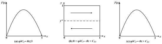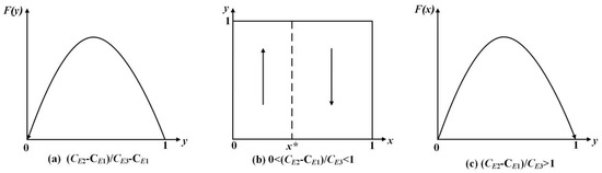 - c. Case 3: If (CE2 − CE1)/CE3 > 1, then 0 ≤ x ≤ 1,1 < (CE2 − CE1)/CE3. Then, we have F′(y)|y=0 > 0, F′(y)|y=1 < 0, and so the ESS is y = 1.