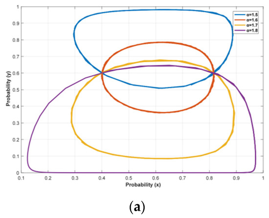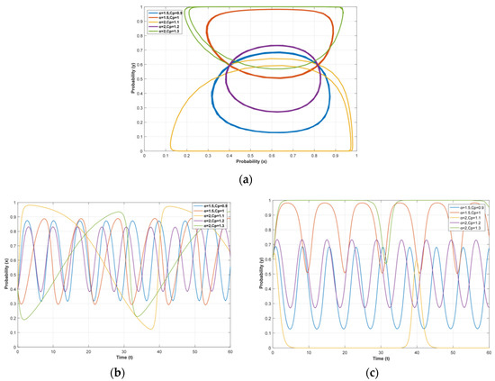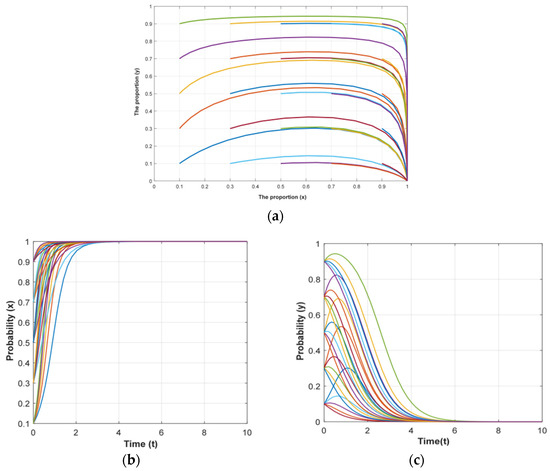 Therefore, the hybrid strategy trajectory of the replicated dynamic system is a closed-loop curve around . If the initial point is close to the equilibrium point , then the strategy trajectory is a circular orbit, which can be expressed as follows: