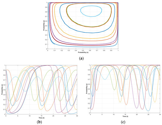 According to the Routh–Hurwitz stability criterion, the centroid (x*,y*) of the replicated dynamical system is not an asymptotically evolving stable strategy because the eigenvalues of are imaginary roots. That is, the system’s system of differential equations is stable in the limit ring, but not asymptotically stable. In this paper, we refer to the literature [64] to explain the periodic fluctuations in replicated dynamical systems, and we study the stability of the fixed points in the above differential equations using Lyapunov’s first method. The trajectory of the replicated dynamical model at the point of hybrid equilibrium is as follows: