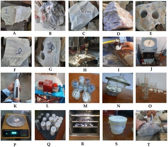 (A) Afghanistan marble, (B) Mardan (spin kala) marble, (C) Chitral marble, (D) Mohmand marble, (E) Bunir Bumbpoha, (F) Chitral marble, and (G) Mohmand (super white) marble. (H) Core drilling, (I) core cutting, (J) triaxial testing machine, (K) Schmidt hammer apparatus, (L) slake durability apparatus, (M) sample dipped for 24 h, (N) desiccator used to cool sample, (O) volumetric cylinder used to find volume, (P) sampling weight, (Q) core samples, (R) oven for drying samples, (S) core failure after UCS testing, and (T) sampling using a Schmidt hammer.