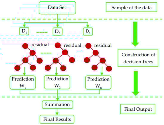 XGBoost stands for Extreme Gradient Boosting, which was proposed by Tianqi Chen and Guestrin, and is an efficient gradient-boosted decision tree (GBDT) ML library that is portable and scalable []. XG boost is an extension of boosting that formalizes the additive creation of weak models, and it uses the gradient descent method over an objective function. XGBoost uses the loss function assessment as a starting point and matches the results to the standard gradient boosting techniques quickly and efficiently [].