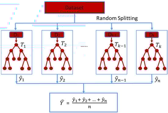 In Equation (2), X represents the input parameter factor, Y represents the prediction result and N shows the number of regression trees formed. Figure 3 shows the basic structure of a Random Forest Regression (RFR) model [].
