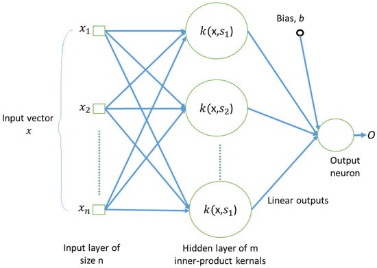 Figure 4 illustrates the architecture of a Support Vector Machine (SVM). The signal vector input is present in the input layer. In the buried layer, an inner-product kernel is created between the input signal vector (x) and the support vector (si). The output neuron receives an addition of the buried layer’s neuron linear outputs. The output neuron is biased [].