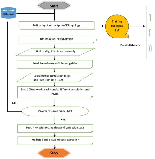 For any regression model in an ANN, a supervised learning method is required during training to provide the highest levels of accuracy and efficiency. In network training, the BP algorithm uses a sequence of instances to establish connections between nodes, as well as to determine the parameterized function []. Many networks are trained using the BP method. According to the available literature, the BP algorithm performs the NN operation by evaluating and implying random variables. There is a need to train the model, and research studies have been conducted to complete this in a better way [].