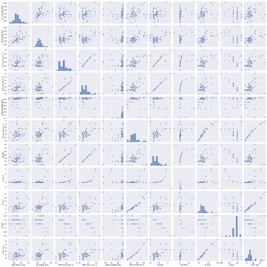 Scatter plot showing the input parameters with uniaxial compressive strength (UCS).