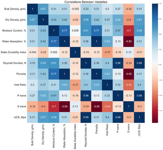 In this study, various parameters were determined in the laboratory using direct methods, i.e., moisture content, bulk density, dry density, water absorption, slake and durability, rebound number, P-wave, S-wave, porosity, void ratio, and UCS. The descriptive statistical analysis of these variables was carried out for a better understanding of their statistical behavior, and the results are presented in Table 1. Furthermore, these variables were analyzed using pairwise correlation with output, and correlation matrix analysis to choose the most appropriate input variables for predicting uniaxial compressive strength (UCS) using different artificial intelligence techniques.