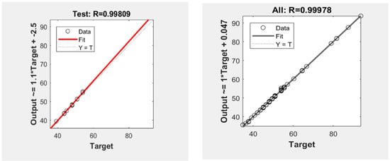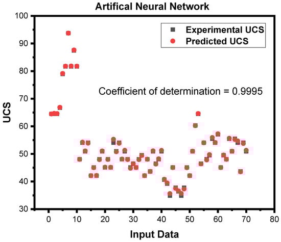 Figure 10 shows the regression data and the ANN training, validation, and testing phases for the UCS model. A good regression is obtained between the predicted and measured UCS values during training, validation, and testing. Figure 10 shows the results of the ANN model draws from the plot graph process. Figure 11 shows a very good R2 value of 0.9995 between the predicted and measured UCS.