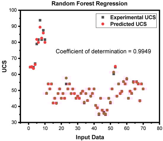 Uniaxial compressive strength (UCS) is an integral parameter significantly used in the effective and sustainable design of tunnels and other engineering structures in civil and mining engineering [,,,,,,,,,,,]. UCS is determined using direct and indirect methods. The direct method proceeded according to ISRM and ASTM [,,,,,] standards on rock samples in the laboratory that involve (1) acquisition of a standard high-quality or NX core sample (54 mm dia) of rock (does not contain any cracks), (2) preparation of the core sample for flatness of both ends within 0.02 mm and parallelism of the upper and lower surfaces within 0.05 mm, and (3) applying load on the sample using a Universal Testing Machine (UTM) machine at the rate of 0.5–1.0 MPa/s. However, extracting high-quality core samples from a weak and jointed rock is challenging, and the arduous laboratory testing procedure may provide hurdles during the determination of UCS []. It takes time and is costly to safely execute UCS in a lab test. The results obtained may be questionable in the case of the presence of discontinuities in the core sample [,]. Therefore, most researchers often prefer indirect methods for estimating UCS. Indirect methods include predictive models developed by different researchers based on mineralogical–petrographic analyses and physical and index properties of rock for estimation of UCS [,,,]. When compared to the direct technique, indirect methods for estimating UCS are quicker, more convenient, and less costly []. For easy understanding, indirect methods are divided into conventional predictive methods and soft computing methods for the estimation of UCS []. The conventional predictive methods use statistical techniques, i.e., simple and multilinear regression modeling. These have been used successfully for predicting UCS [] and simultaneously correlate inputs with output (i.e., multilinear regression) []. Linear and multilinear regression have the problem that they can only predict the mean values, and when the data are bigger, they cannot accurately predict the values that are needed. As a result, these approaches are less suitable for application in nonlinear and multivariable engineering issues [,,,,,,,].