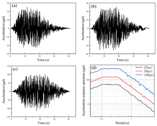 Input ground motion: (a) acceleration time range (PGA = 25 gal); (b) acceleration response spectrum (PGA = 50 gal); (c) acceleration time range (PGA = 100 gal); (d) acceleration response spectrum.