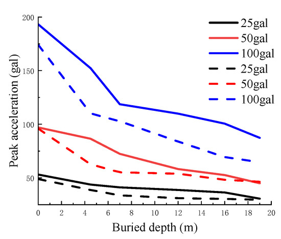 - Under the same input ground motion level, the burial depth of the soft soil layer influences the peak ground acceleration. Specifically, as the burial depth increases, the peak ground acceleration decreases, and the rate of attenuation is faster near the surface. Conversely, as the burial depth increases further, the rate of attenuation becomes slower. Under different input ground motion levels, higher input peak accelerations result in faster attenuation of the peak ground acceleration. In other words, as the input peak acceleration increases, the rate of attenuation becomes more rapid. Similarly, the thickness of the soft soil layer impacts the peak ground acceleration. A thicker soft soil layer leads to a smaller peak ground acceleration, and the attenuation is faster near the shallow surface. The difference becomes more prominent as the input ground motion peak acceleration increases.