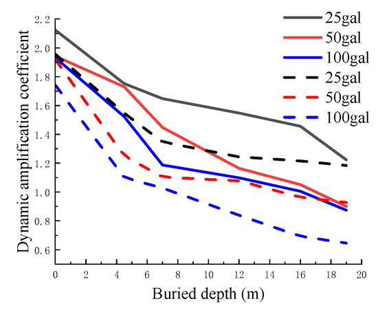 As can be seen from Table 5, at the same input peak acceleration level, the thicker the soft soil layer, the smaller the dynamic amplification coefficient of surface peak acceleration; the deeper the soft soil layer is buried, the smaller the dynamic amplification coefficient of surface peak acceleration; and the attenuation of the dynamic amplification coefficient is slower as the burial depth increases. Under the same thickness and burial depth of the soft soil layer, with the increase in input peak acceleration, the dynamic amplification coefficient of surface peak acceleration gradually decreases, which indicates that the site soil has significant nonlinearity.