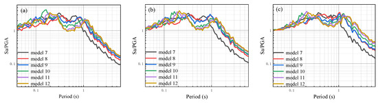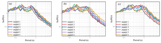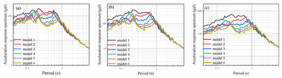 Site-related acceleration response spectra of each analysis model with two layers of silt at different input ground motions: (a) Input ground motion peak acceleration of 25 gal; (b) input ground motion peak acceleration of 50 gal; (c) input ground motion peak acceleration of 100 gal.