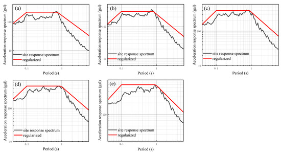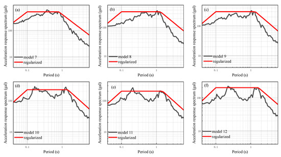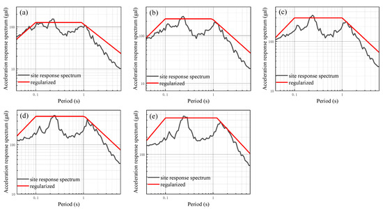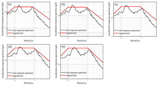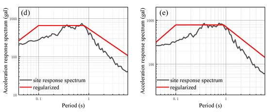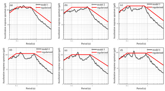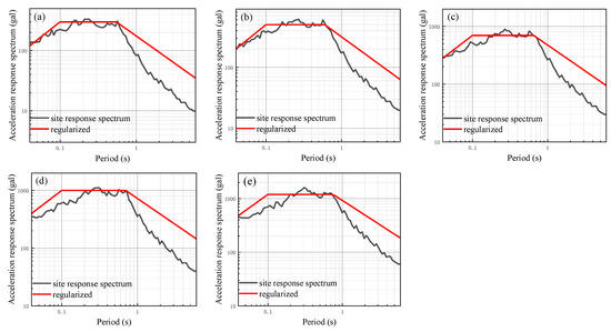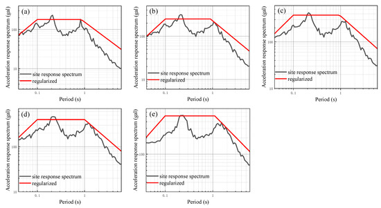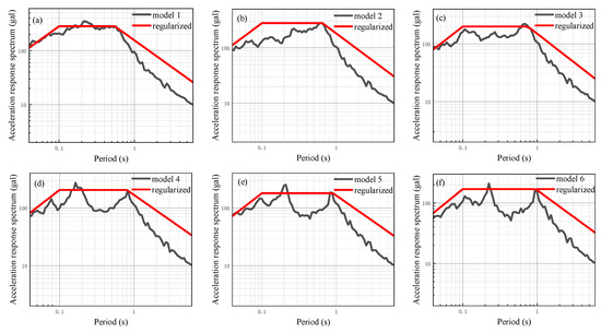 In order to further analyze the impact of different input peak acceleration levels on the seismic response of the site with a soft soil layer, additional seismic responses are calculated using input peak accelerations of 50 gal, 100 gal, 150 gal, 200 gal, and 300 gal. These calculations are performed by modulating the ground motion time history of 25 gal using amplitude modulation. The results of the one-dimensional site seismic response analysis of models 1 to 6 are presented in Figure 14, Figure 15, Figure 16, Figure 17, Figure 18 and Figure 19, which show the site-related acceleration response spectra. On this basis, the calculated site-related acceleration response spectrum is regularized according to the aforementioned method, leading to the regularized response spectrum and related parameters. The regularized spectrum can be found in Figure 14, Figure 15, Figure 16, Figure 17, Figure 18 and Figure 19. Additionally, the characteristic period of the regularized spectrum is summarized in Table 8.