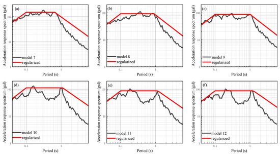 Site acceleration response spectrum of each analysis model containing two layers of silt under input ground motion with a peak acceleration of 25 gal: (a–f) corresponding models 7 to 12.