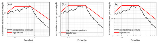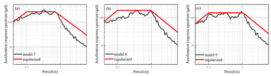 Site-related normalized spectrum of each calculation model with two layers of silt under different input ground motions: (a) Input ground motion peak acceleration of 25 gal; (b) input ground motion peak acceleration of 50 gal; (c) input ground motion peak acceleration of 100 gal.