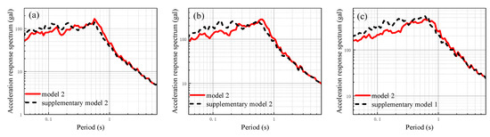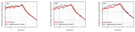 The site-related acceleration response spectra of supplementary model 1 and analysis model 2 under different input ground motions: (a) Input seismic peak acceleration 25 gal; (b) input seismic peak acceleration 50 gal; (c) input seismic peak acceleration 100 gal.