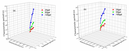 From Figure 8, Figure 9, Figure 10, Figure 11, Figure 12 and Figure 13 and Table 7, it can be seen that at the same input peak acceleration level, there is a trend where the response spectrum characteristic period increases with the thicker soft soil layer thickness. Additionally, the characteristic period of the response spectrum also increases with the deeper burial of the soft soil layer. Moreover, it can be observed that as the burial depth increases, the rate of increase in the response spectrum characteristic period gradually decreases, while the rate of increase near the shallow surface is faster. Additionally, the response spectrum characteristic period gradually increases with the increase in input peak acceleration while keeping the soft soil thickness and burial depth constant.