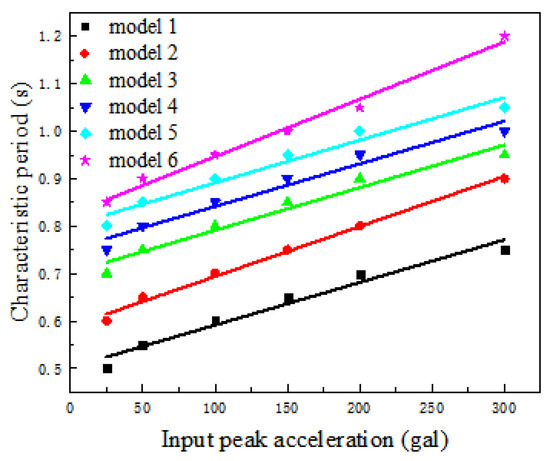 From Figure 14, Figure 15, Figure 16, Figure 17, Figure 18 and Figure 19 and Table 8, it is shown that the response spectrum characteristic period of each analysis model increases with the increasing input ground motion level. The response spectrum characteristic period of model 1 increases gradually from 0.50 s to 0.75 s; model 2 increases from 0.6 s to 0.9 s; model 3 increases from 0.7 s to 0.95 s; model 4 increases from 0.75 s to 1.0 s; model 5 increases from 0.8 s to 1.05 s; and model 6 increases from 0.85 s to 1.2 s. It can be observed that the characteristic period of the response spectrum increases roughly linearly with the increase in the input ground motion level.
