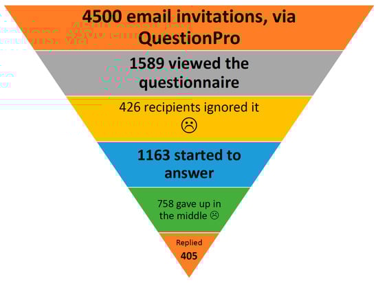 To decode several Greek business managers’ perceptions of the indicators’ importance, we used the findings of a survey for sustainability. The survey was conducted in Greece, a year before the SDGs adoption by the United Nations, using the web-based software “QuestionPro” [27]. Particularly, a questionnaire that was distributed to more than 4.500 business emails, both to public and private organizations, intended to evaluate 38 evenly distributed (across the three pillars) sustainable development indicators. Upon completion of the survey, over 400 responses were received, enabling us to form a new coefficient, named the “Indicator’s Gravity Factor (G)”. The “G” coefficient reflected each indicator’s significance in the business world. Its values were the result of the senior officers’ replies, reflecting their responses’ mean value to a range of Likert scale questions associated with the 38 sustainability indicators. To quantify the “G” coefficient, the questions used a 5-point scale, ranging from “Not at all important” to “Very important”, assigned with values ranging from 1 to 5, respectively. The mean values were calculated and analyzed by the QuestionPro web-based tool. In Figure 1, the survey’s statistics are graphically illustrated.