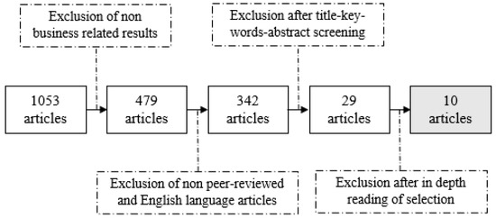 The initial search retrieved 1053 articles. After removing results that did not fit our research areas (i.e., that belonged to the fields of engineering, chemistry, materials, computer science, intellectual property law, etc. and were more generally not business and management oriented) the results set was reduced to 479 articles. We then excluded studies that were not peer-reviewed journal articles (i.e., conference proceedings, early access, retracted publications or book chapters) in English language and obtained 342 articles of which we screened the titles, abstract and key words to refine our sample. A vast majority of the articles were excluded because the term “cross-industrial” and other synonyms did not refer to research objects that actually straddled several industrial sectors but to samples where several industrial sectors were represented, reducing the number of articles to 29. Finally, a reading of the content of the articles allowed us to determine whether the research addressed empirical fields that were de facto cross-industrial without this particular dimension and its implications being specifically investigated, or if the studies were conducted on cases where cross-industry collaborations and their specific mechanisms were the object of the research. We have selected the latter option, ultimately reaching a number of 10 articles. Special attention was given to the studies with a sustainability dimension when reading the sample. Figure 1 summarises the literature review steps.