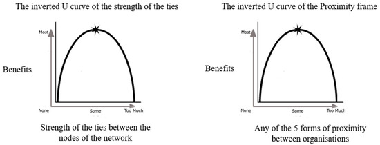 We have already established above that the two theoretical bases have in common the fact of dealing with the description of the complex phenomena of cooperation within the supply network; there is thus a proximity between the two frameworks. It remains to highlight their compatibility. The central assumption of network theory is that “no strong tie is a bridge” [19] (p. 1364) meaning that the weak connections provide the best resources and opportunities. The central assumption of the proximities framework is that “to function properly, proximity requires some, but not too great, distance between organizations”[20] (p. 12). Boschma himself highlighted this congruence when he stated that the firm embeddedness level and its innovative performance follows an inverted U shape [20] and that this “positive relationship between embeddedness and innovation is more or less in line with Granovetter’idea” [20] (p. 15). The compatibility of the assumptions underpinning the theories is thus established and visually represented in Figure 2.