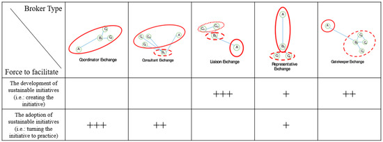 Brokerage exchange types and associated forces for sustainability initiatives management, adapted from Saunders et al. (2019) [82].