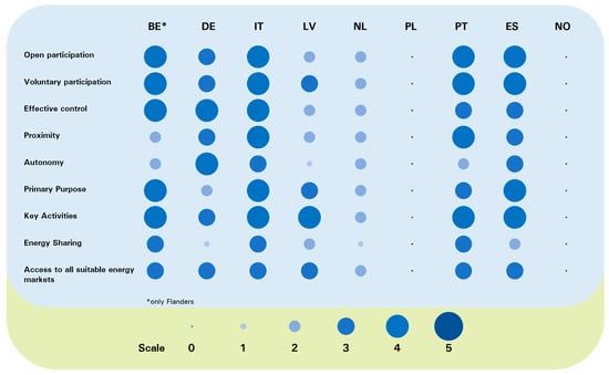 However, only a few cross-country studies investigated the transposition in a comparative, comprehensive, and systematic manner also covering the minimum requirements an enabling framework must comprise according to the RED II. Hannoset et al. [45] provided one of the first comprehensive and systematic overviews of the existing and emerging legal and regulatory framework for energy communities in nine EU countries covering the existing energy community landscape, definitions of RECs and CECs, governance principles, rights, market activities and responsibilities, selected elements of an enabling framework, financial incentives, and support measures. Toporek and Campos [29] assessed the regulatory frameworks and policy instruments for renewable energy-based prosumer initiatives in the EU and in nine participating Member States. Their analysis also covered RECs focusing on definitions, rights, incentives, and barriers. In 2020, the same authors re-assessed the transposition progress related to RECs and CECs in six countries by referring to the integrated National Energy and Climate Plans [30].