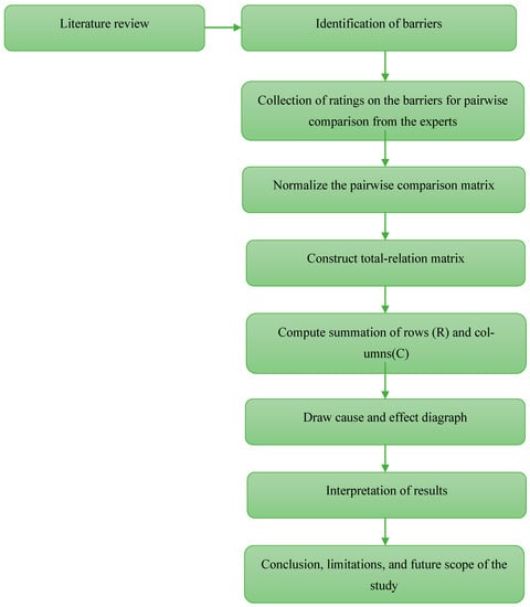 Upon assessing various MCDM methodologies, such as AHP, TOPSIS, and Best Worst Method, and considering that the obstacles were interdependent, this study’s emphasis should be on determining the links between them. The methodology adopted is shown in Figure 1. DEMATEL established itself as the ideal solution. DEMATEL supports interdependent criteria and is effective for determining the cause-and-effect linkages between the obstacles as well as determining which one is the most significant.