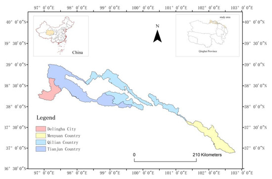 Qilian Mountain National Park is located on the northwestern border of the Qinghai-Tibet Plateau, at the northern foot of the Qilian Mountains where the three major plateaus of Qinghai–Tibet, Mongolia–Xinjiang and Loess meet. The national park covers an area of 52,000 km2 and lies between 36°47′–39°48′ N and 94°51′–102°60′ E (Figure 1). The sample collection area is the Qinghai area of the national park, which is populated by a total of 115,600 people in 119 village (pastoral) committees in 20 townships and 4 counties and cities in Delingha City, Tianjun County, Qilian County, and Menyuan County. Traditional livestock and crop farming are the main livelihood activities in the area. The annual average precipitation is approximately 400 mm, with a mean annual temperature of 4 °C. At present, the Qinghai area is a key subject of the reform of the national park system, with emphasis on protection and ecological restoration. However, institutional changes also significantly affect the livelihoods of vulnerable farmers and herders, making the contradiction between ecological protection and farmers’ livelihoods acute. Therefore, it is of urgent practical importance to improve the adaptability of farmers and herders to the institutional changes caused by the national park pilot.