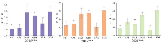 The relationship between household well-being and livelihood strategies. Note: NS is the nomadic livelihood strategy; APS is the agriculture–pastoral livelihood strategy; NAS is the nonagricultural livelihood strategy; GDS is the diversified grazing livelihood strategy; SAS is the settled agricultural livelihood strategy; SDS is the settlement diversified livelihood strategy; *** represent significant differences in well-being under different livelihood strategies at the 1% levels. A. AB, C, etc. are obtained from one-way ANOVA, and different superscripts indicate significant differences at the 5% level.