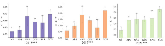 ANOVA for basic material needs and livelihood strategies. Note: BMN represents basic material needs. APS is the agriculture-pastoral livelihood strategy; NAS is the nonagricultural livelihood strategy; GDS is the diversified grazing livelihood strategy; SAS is the settled agricultural livelihood strategy; SDS is the settlement diversified livelihood strategy. *** represents significant differences in well-being under different livelihood strategies at the 1% levels. A. AB, C, etc. are obtained from one-way ANOVA, and different superscripts indicate significant differences at the 5% level.