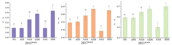 ANOVA for freedom and choice and livelihood strategies. Note: FC represents freedom and choice. APS is the agriculture-pastoral livelihood strategy; NAS is the nonagricultural livelihood strategy; GDS is the diversified grazing livelihood strategy; SAS is the settled agricultural livelihood strategy; SDS is the settlement diversified livelihood strategy. *** represents significant differences in well-being under different livelihood strategies at the 1% levels. A. AB, C, etc. are obtained from one-way ANOVA, and different superscripts indicate significant differences at the 5% level.