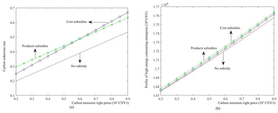 As can be seen from Figure 4, carbon trading prices without subsidies, product subsidies and cost subsidies have the same influence trend on carbon emission reduction rate and profits of high energy-consuming enterprises. Carbon emission reduction rate and the profits of high energy-consuming enterprises under product subsidies and cost subsidies are all higher than those under no subsidies, indicating that the subsidy strategy can effectively motivate enterprises to carry out carbon emission reduction work. Compared with cost subsidies, the carbon emission reduction rate and profit of high energy-consuming enterprises are higher than that of cost subsidies. However, with the increase in carbon emission right price, the sensitivity of product subsidies to carbon emissions decreases gradually. Therefore, the government should flexibly formulate subsidy strategies according to the change in carbon price.