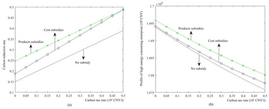 As can be seen from Figure 5, the carbon tax rate without subsidies, product subsidies and cost subsidies have the same influence trend on the carbon emission reduction rate and the profits of high energy-consuming enterprises. The carbon emission reduction rate and the profits of high energy-consuming enterprises under product subsidies and cost subsidies are all higher than those without subsidies, indicating that the subsidy strategy can effectively motivate enterprises to carry out carbon emission reduction work. Compared with cost subsidies, the carbon emission reduction rate and profit of high energy-consuming enterprises are higher than that of cost subsidies, and the incentive effect of product subsidies is more obvious than that of cost subsidies.
