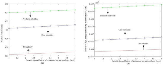 As can be seen from Figure 6, the low carbon level sensitivity coefficient of consumers without subsidies, product subsidies and cost subsidies have the same influence trend on carbon emission reduction rate and profits of high energy-consuming enterprises. Carbon emission reduction rate and profits of high energy-consuming enterprises under product subsidies and cost subsidies are all higher than those under no subsidies, indicating that the subsidy strategy can effectively motivate enterprises to carry out carbon emission reduction work. Compared with cost subsidies, the carbon emission reduction rate and profit of high energy-consuming enterprises are higher than that of cost subsidies. With the increase in the consumers’ sensitivity coefficient of low carbon levels, the influence of product subsidies on carbon emissions is gradually reduced, but it is still greater than that of product subsidies. Moreover, under the strategy of product subsidies, enterprises’ profits increase and change their name obviously. Government product subsidies give companies a greater incentive to invest in low-carbon technologies.